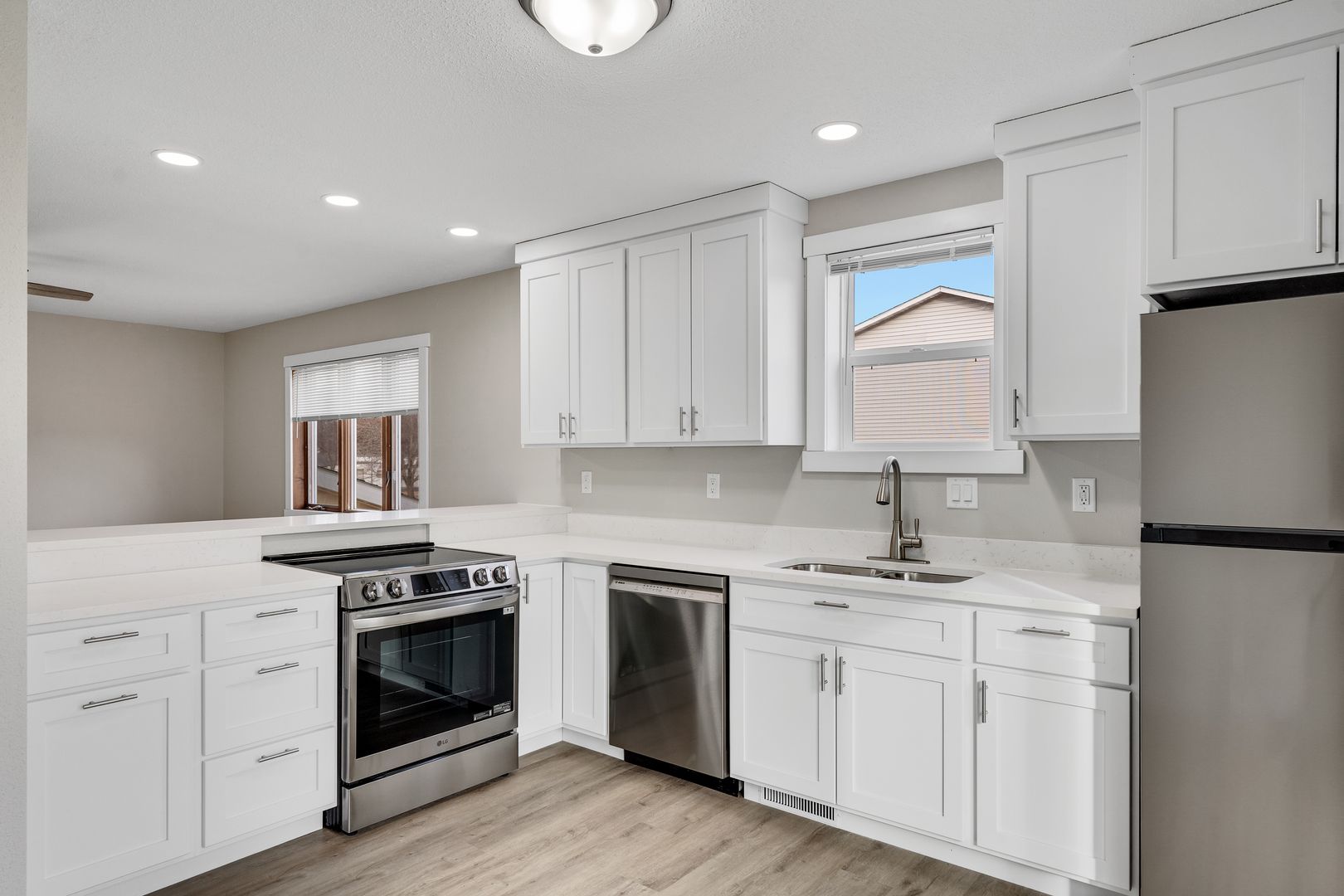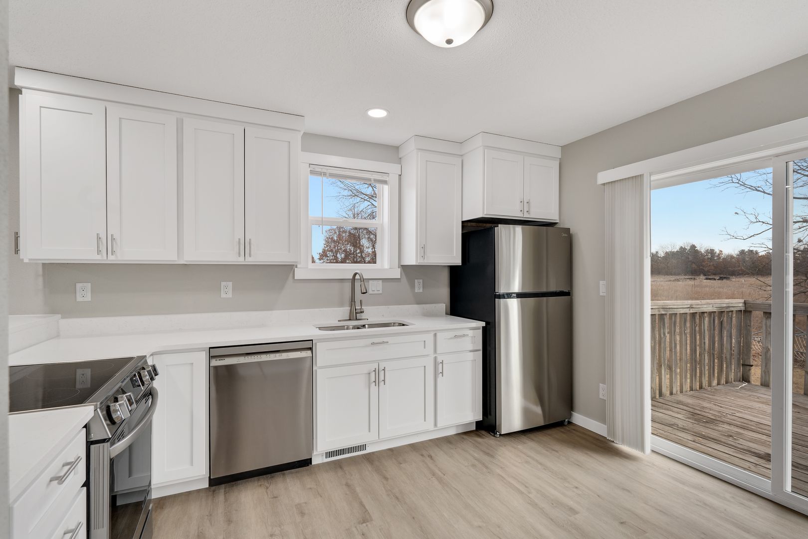 Discover the perfect blend of comfort and style in this beautifully remodeled 3-bedroom, 1-bathroom duplex. Featuring brand-new LVP flooring throughout, this home offers both durability and modern appeal. The kitchen is a standout with stunning custom Amish cabinetry, solid surface countertops, and brand-new stainless steel appliances, combining elegance with functionality.